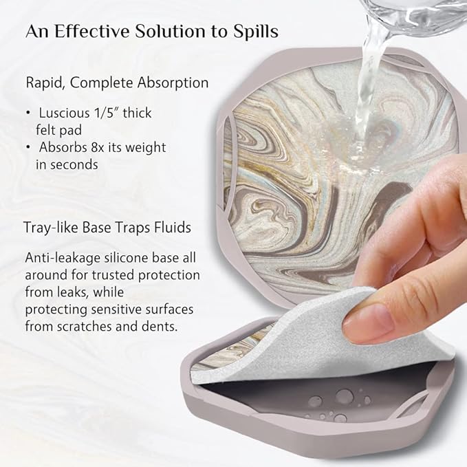 - RESPECT WOOD - Featuring material mashup, it effortlessly protects your table - all day, every day [ Safe from Spills and Permanent Damage ] The 1⁄5" thick soft felt pad can absorb as much as ¼ cup of liquid in seconds, and the silicone base offers leak-free protection while protecting your sensitive surfaces from scratches and dents [ Elevated Experience ] The embossed geometric pattern enhances grip without leaving residue while keeping air circulating to make the coaster easier to pick up