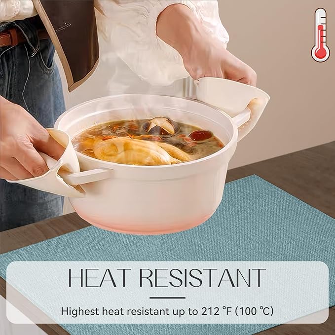 - THICKENED AND HEAT-RESISTANT: Our placemats feature a double-layered faux linen fabric which is heat-resistant up to 220°F (100°C) . They will prevent hot dishes, stains, and scratches from damaging your tables or furniture.