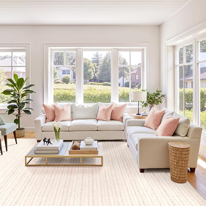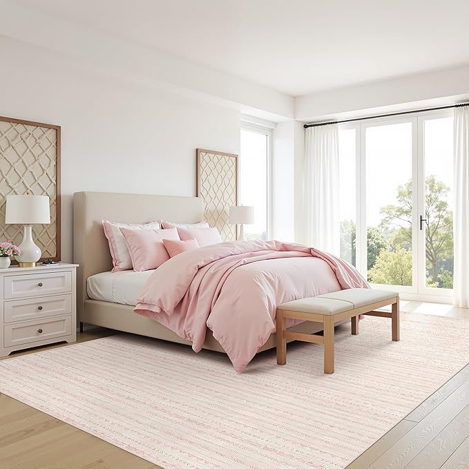 - High-quality Low Pile Pink Rug: Our pink 10x14 area rug is skillfully made from premium fiber which makes it ultra-soft and comfortable, better withstanding daily wear and tear. Designed at 0.2 inches, this soft neutral pink rug fits any season and will not obstruct the doorway. Expertly machine-woven and reinforced lock edges ensure non-shedding.