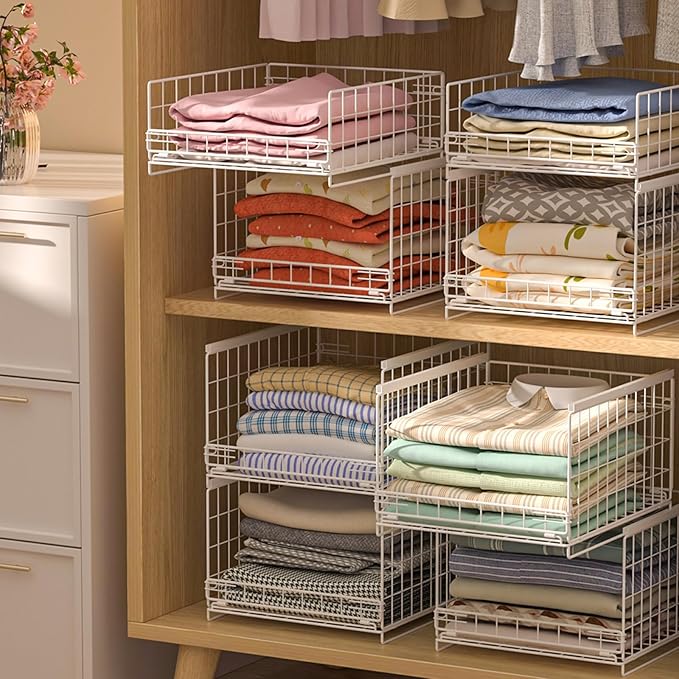 - [Multi-Use Storage Solution]: 4-tier stackable closet organizer bins for organizing clothes, pantry items, toiletries, office supplies & more! Space-saving vertical design fits closets (bedroom/entryway), kitchens, office or study areas. Achieve clutter-free spaces in 5 mins