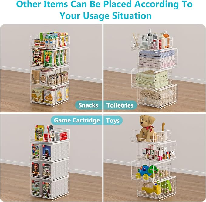 - [Pls Note]: The stackable baskets cannot slide out completely like the drawer. If you need to pull out, please support it against the wall. The first-layer organizer can be easily pulled out.When pulling out the second and third floors, you need to hold the drawer with one hand and pull out the other with the other hand. As there is no external support, the fourth layer cannot be pulled out