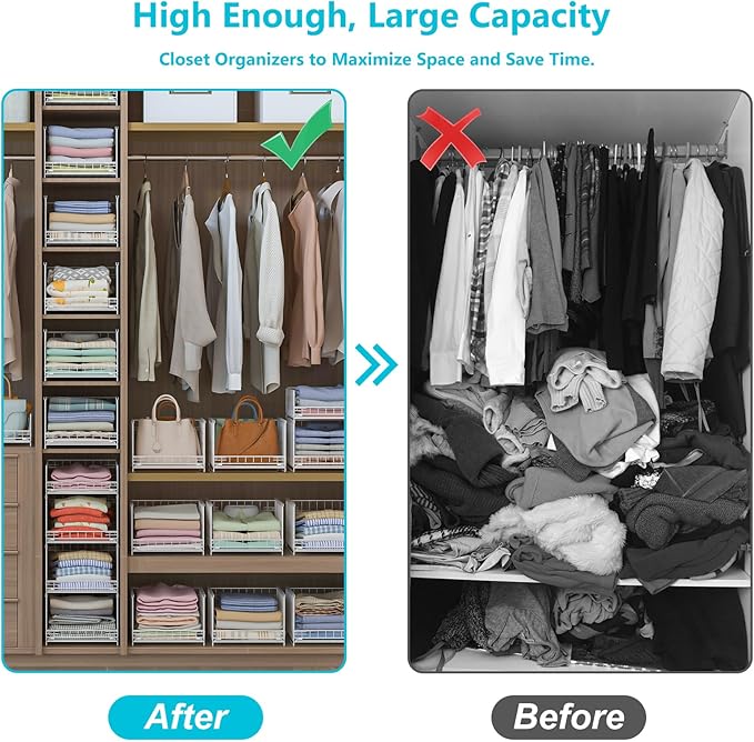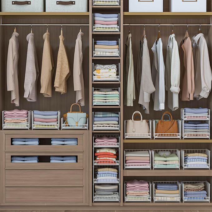 - [Premium Quality & Sturdy]: The wardrobe organizer features high-quality carbon steel frames with matte white anti-rust coating that outlast flimsy fabric/plastic organizers, only wipe it with wet cloth for daily cleaning. With this simple and stylish looking sliding basket organizer drawer, you can easily sort and access your clothes as needed