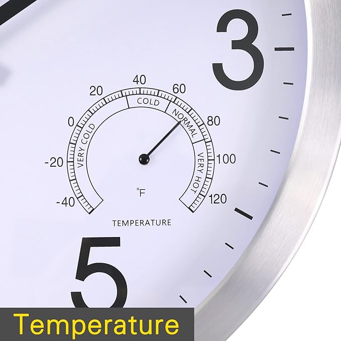 - 🕘Aluminum Wall Clock. 14 inch wall clock with temperature and humidity is made of premium aluminum frame and clear glass. The white clock face with large black Arabic number makes it easy to read from a long distance