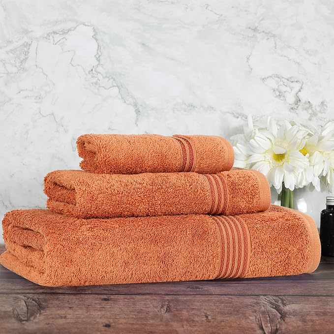 - OPULENT COMFORT: Egyptian Cotton terry loop is highly absorbent to get you dry quickly; single-ply for added comfort and durability; ultra-plush and soft towels for daily use; set includes 1 hand towel, 1 face towel/ washcloth, and 1 bath towel