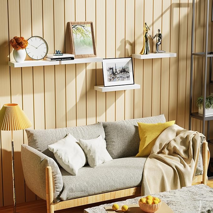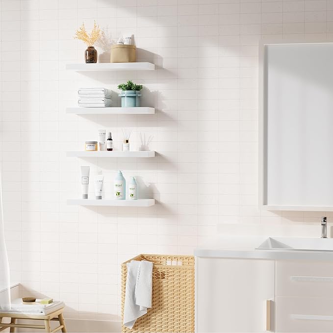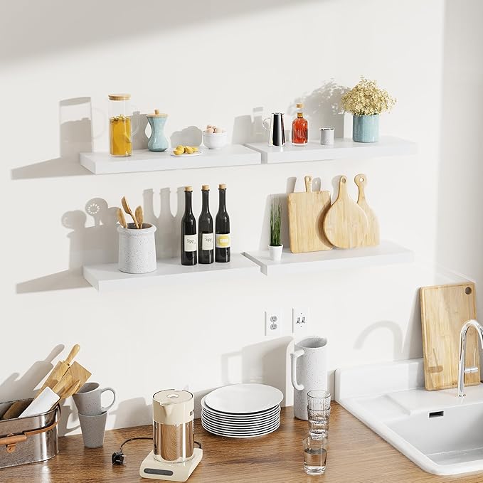 - 【Versatile & Functional】Our white floating shelves for wall can simplify our life which let everything will be in reach. Our wall shelf is a perfect space to display our family pictures, books, memorandums, charming antiques or artwork, spices or jars and fresh green plant. Our floating shelf wood not only give us extra storage but also improve the beauty of our home decor. Our white shelves can be perfectly integrated and decorated in the bathroom, kitchen, living room, bedroom and other place.