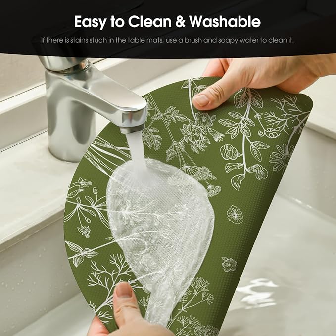 - Easy To Clean:The washable vinyl placemats simply wipe with soap,water and a soft sponge or cloth.Scrub stubborn stains with a soft bristle-brush and a bleach-based cleanse.