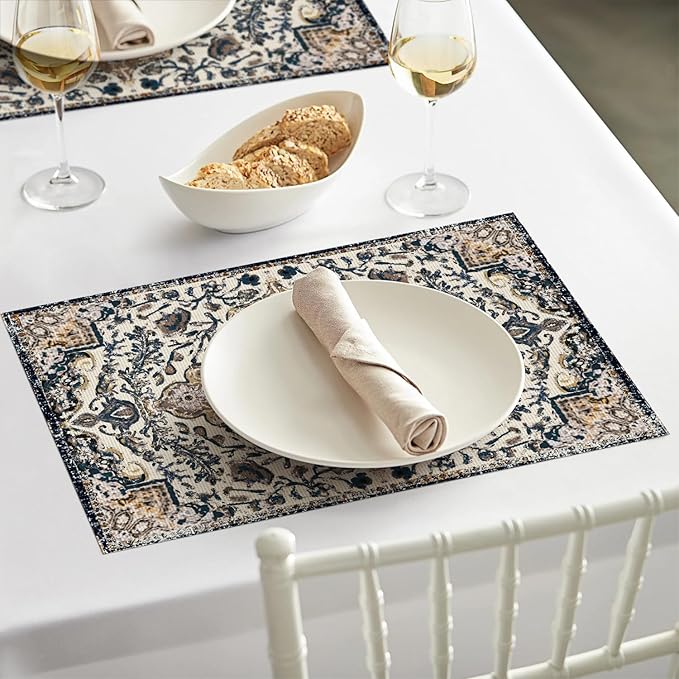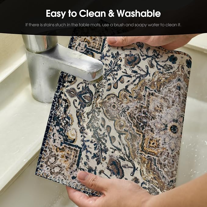 - Easy To Clean:The washable placemats simply wipe with soap,water and a soft sponge or cloth.Scrub stubborn stains with a soft bristle-brush and a bleach-based cleanse.