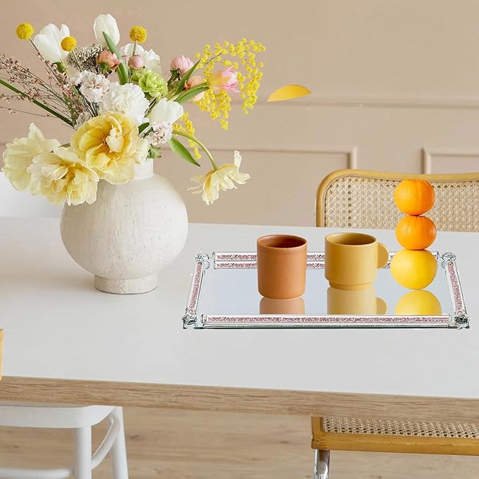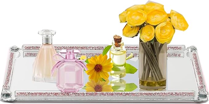 - ELEGANT DESIGN : Our glass vanity tray is made of crystal glass, and the four sides of the rectangle are filled with sparkling crystal diamond home decor. The surface of the tray is mirror, smooth and bright. There are four non-slip rubbers on the bottom to help you prevent scratches on the tabletop.