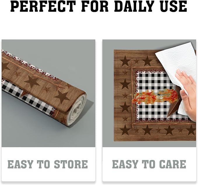 - 【PLACEMAT SIZE】Our brown texas stars buffalo plaid placemats measures 18 x 12 Inch (45x30cm). A set of 4 placemats, the plate and fork are not included. Reusable placemats are good heat insulation effect, will protect your tabletop from heat,thus extending the service life of your table.