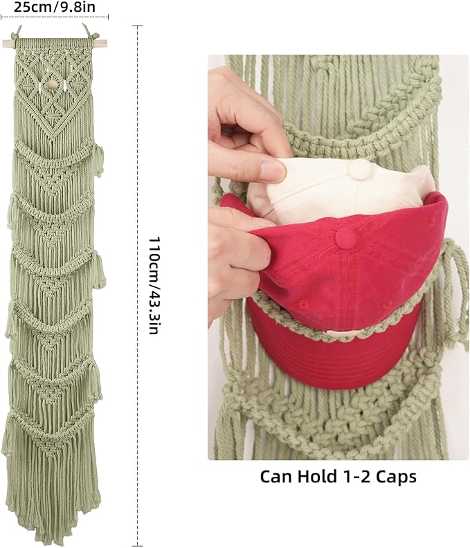 - Large Capacity: Designed with 6 holders, each macrame cap holder can hang up to 12 hats. Package Includes: 1 pack macrame cap holder. Size: 43.3" H x 9.8" W.