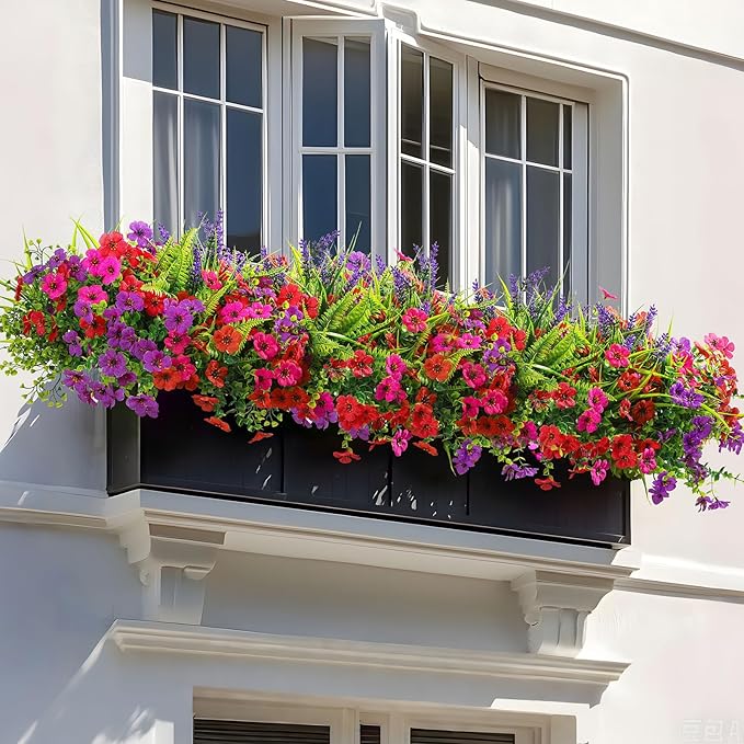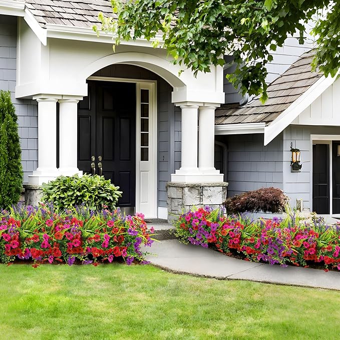 - 🌸【Perfect for Outdoor/Indoor】Plastic flowers are ideal for outdoor porches, walkway, terraces window box, front yard, pots ,hanging planters, gardens, landscape, windowsills, allow you have beautiful color all year around. Also suit for birthdays, weddings, memorial place or grave, they can live anywhere and have withstood heavy rain storms and winds.