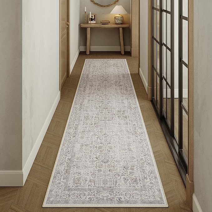 Taupe Runner Rug 3x12 Hallway Machine Washable Kitchen Vintage Distressed Non Slip Long Carpet Indoor Retro Floral Bedroom Accent Throw Rug for Bathroom Office Laundry Dining Living Room