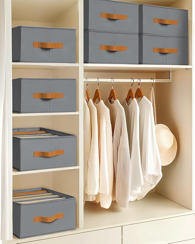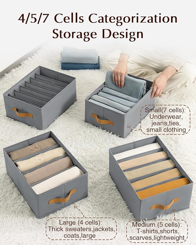 - Partitioned Organizer Design: The cloth clothing organizer measures 14.17 x 10.62 x 6.69 inches, this 3-pack closet organizer set includes 16 grids with three versatile spacing options: 4-cell (1 pieces), 5-cell (1 pieces), and 7-cell (1 pieces). The large size (4 cells) is perfect for thick sweaters, jackets, and coats; the medium size (5 cells) is ideal for t-shirts, shorts, and lightweight pants; and the small size (7 cells) is designed for underwear, socks, ties, and other small items