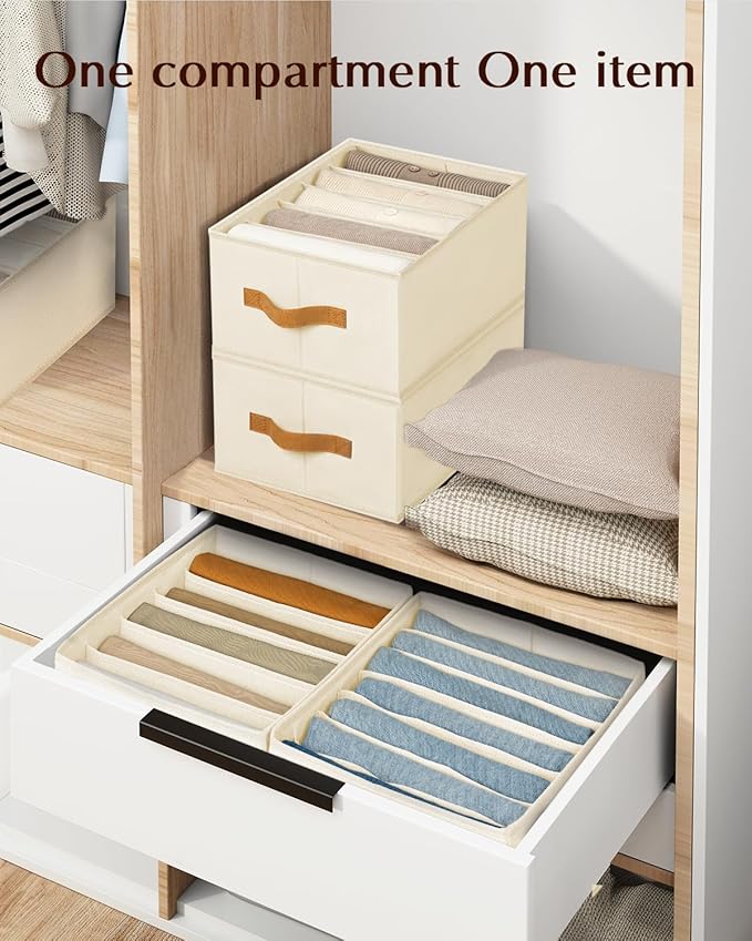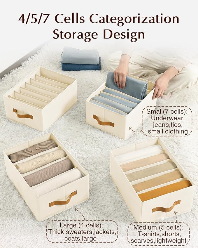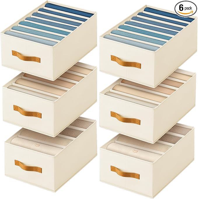 Clothes Organizers and Storage - 4/5/7 Grids Fabric Jeans Organizer with Handles, Foldable Closet Organizers Dividers, Wardrobe organizer for Pant, Sweater, T-shirt, Scarf, 6 Pack, Beige
