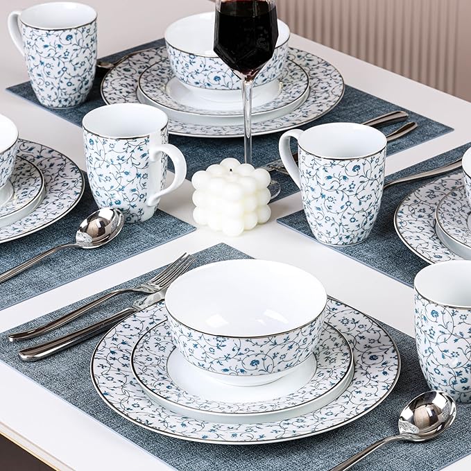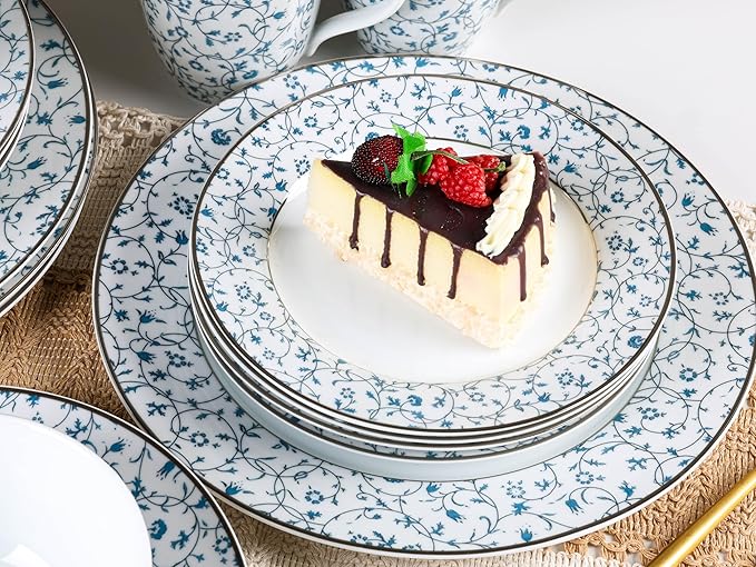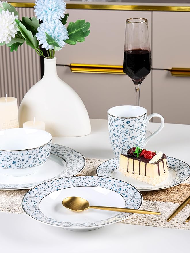 - EXQUISITE DESIGN: Featuring a blue and white floral pattern with hand-gilded gold rims, the design is both exquisite and luxurious. The intricate flower-and-vine patterns and excellent craftsmanship make this **fine china dinnerware set** perfect for adding decor to your kitchen and elevating your dining experience.