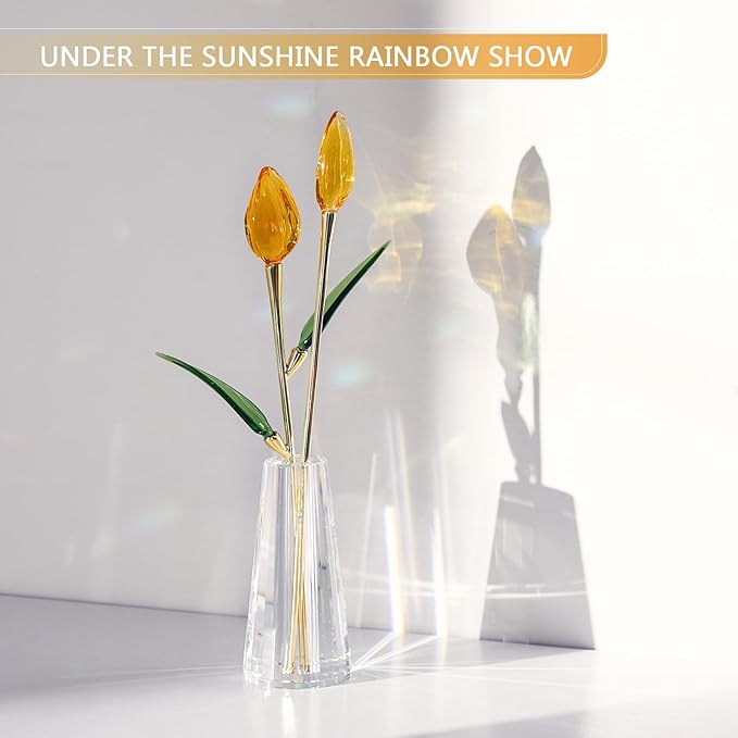 Crystal Tulip Figurine - Yellow Glass Flowers with Vase, Glass Flower Bouquet Collectible Office Home Decor Paperweight - Tulip Gifts for Women Mom Bestfriend Wedding Anniversary