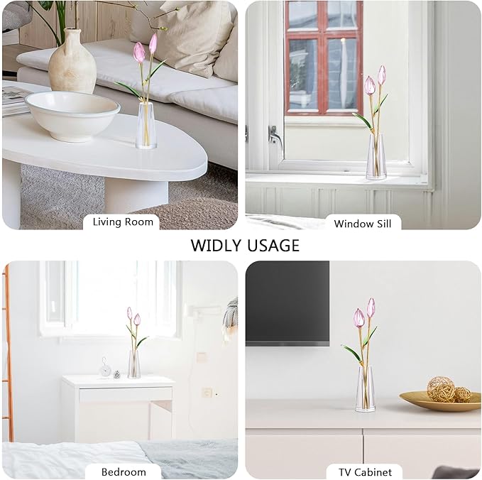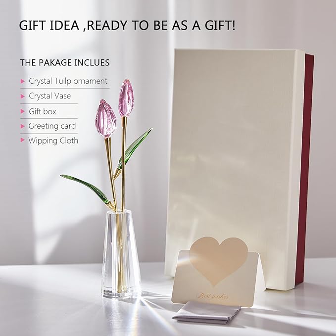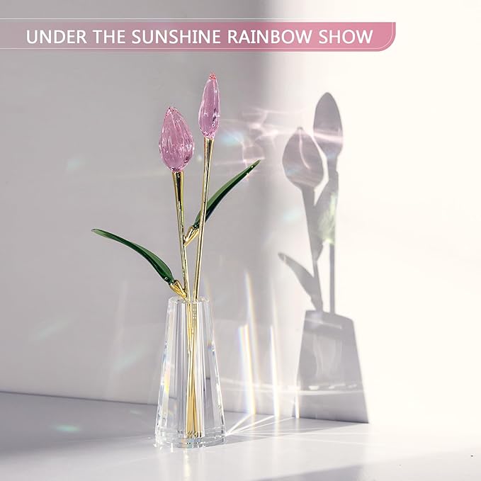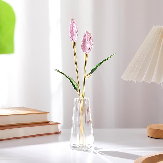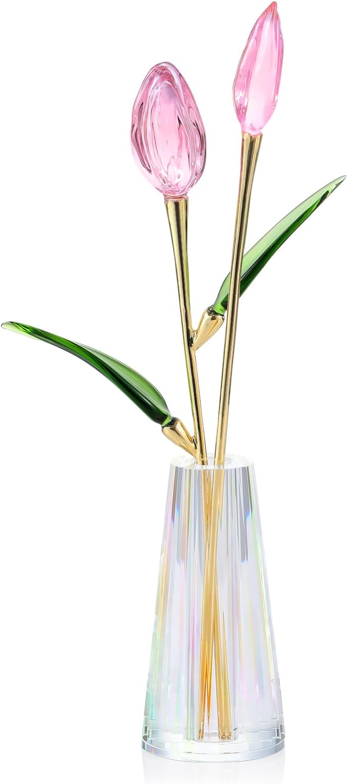 Crystal Tulips Figurine - Pink Flowers with Vase - Glass Flower Bouquet Collectible Office Home Decor Paperweight - Tulip Gifts for Women Mom Bestfriend Wedding Anniversary