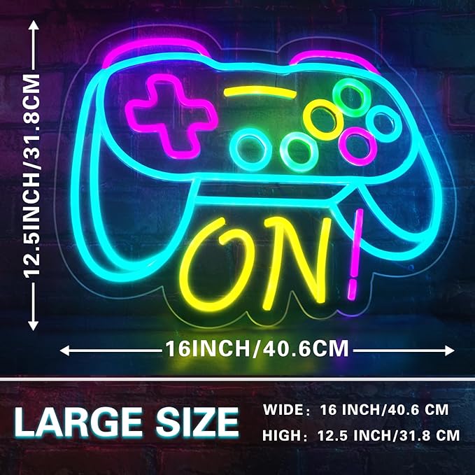 - 🎮【Large, Bright and Colorful】The size of gaming neon sign room decor for boys is 16“*12.5”/40.6cm*31.8cm, which is larger than other similar products. Imagine stepping into a dedicated gaming space, the first thing that comes into view is dazzling gaming lights for wall. Its oversized design instantly becomes visual focus, making every inch of wall filled with surging e-sports atmosphere. Bottom plate is 6mm thick, weight is 0.65kg, USB data cable is 79" (2m).It comes with 4 screws and chains.