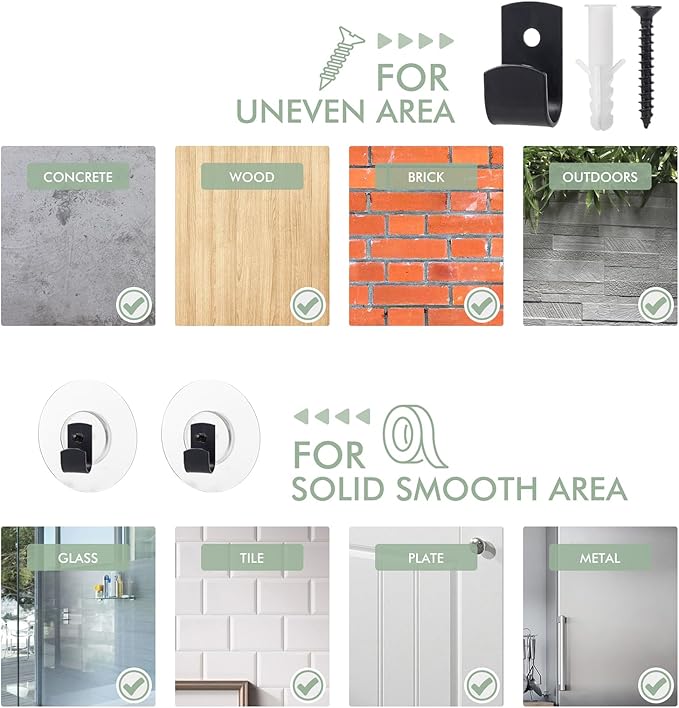 - Durable and Reliable - Built with sturdy iron construction, the adhesive pads support up to 12 lbs, while the screw hooks can handle up to 22 lbs. Perfect for both lightweight and heavy-duty storage in workshop, kitchen, or garage.