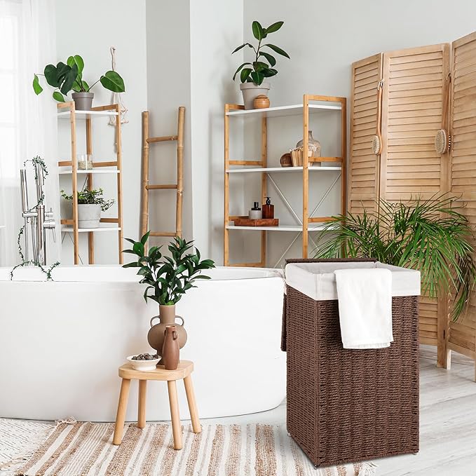 OIAHOMY Laundry Hamper with Lid, 17.2 Gal (65L) Wicker Hamper with Removable Liner Bag, Handwoven Clothes Basket with Handles, Foldable Paper Rope Basket for Laundry Room, Bedroom-Brown