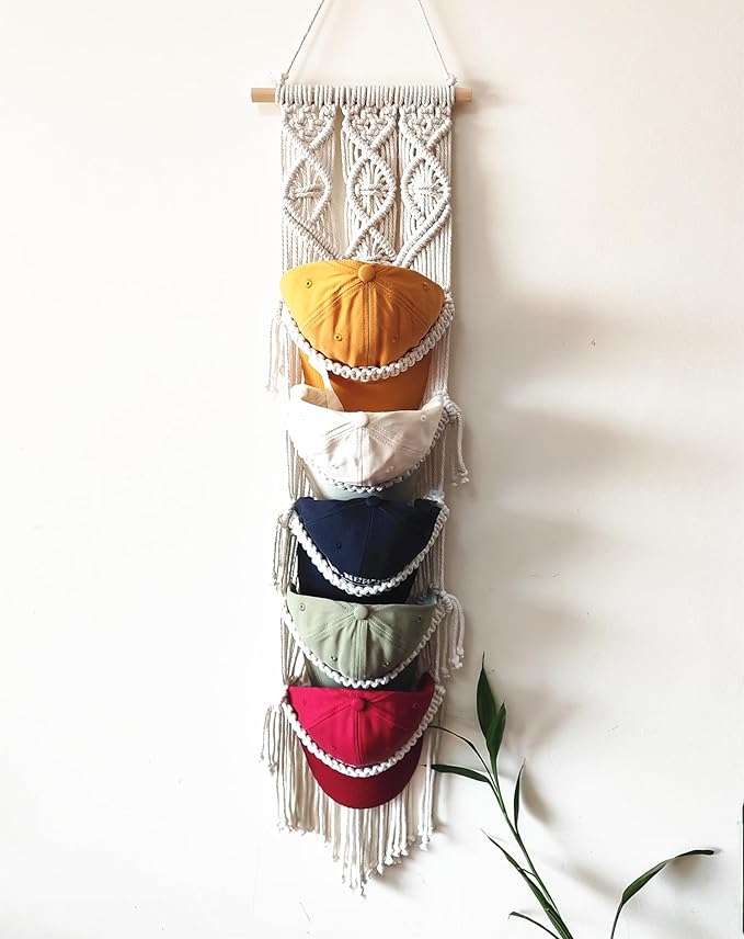 Macrame Cap Holder, Boho Hats organizer for baseball Caps, Hat Rack for Wall Hanging Decoration, Cap Rack for collection Display, Handmade Cap Hanger Storage Organizer (Five hats)