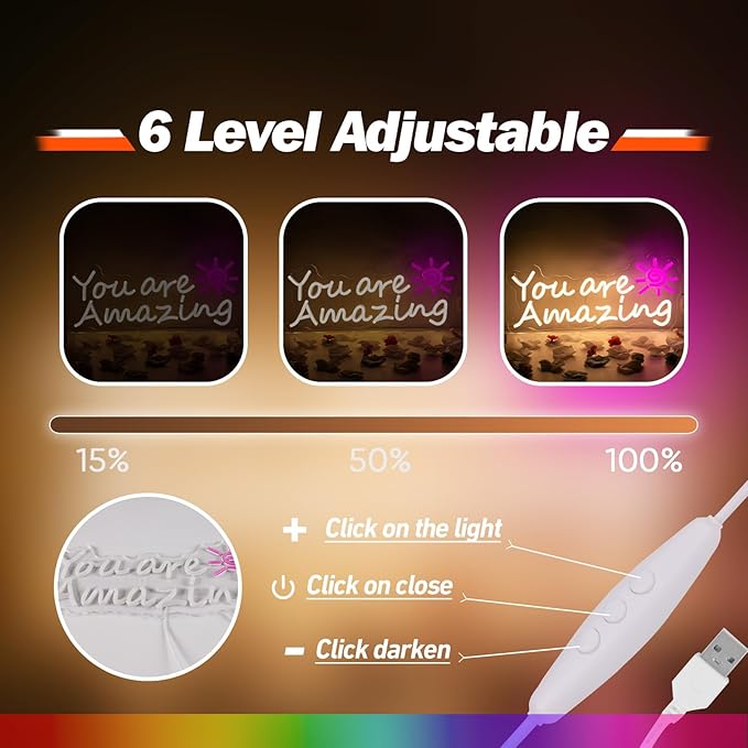 - Unique Design: The You Are Amazing neon sign features the letters 'You Are Amazing'and a pink sun design. The warm white lighting creates a comfortable and cozy atmosphere, with soft tones that bring rich color layers to the space. The text on the LED neon lights enhances your confidence and inspires yourself.