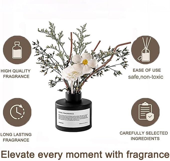 - Includes: One fragrance diffuser 3.38oz ,A bouquet of dried flowers (real flowers preserved through a special process), and Rattan sticks. In addition, free send 5pcs/pack diffuser sticks. Enjoy lasting fragrance for 30-50 days