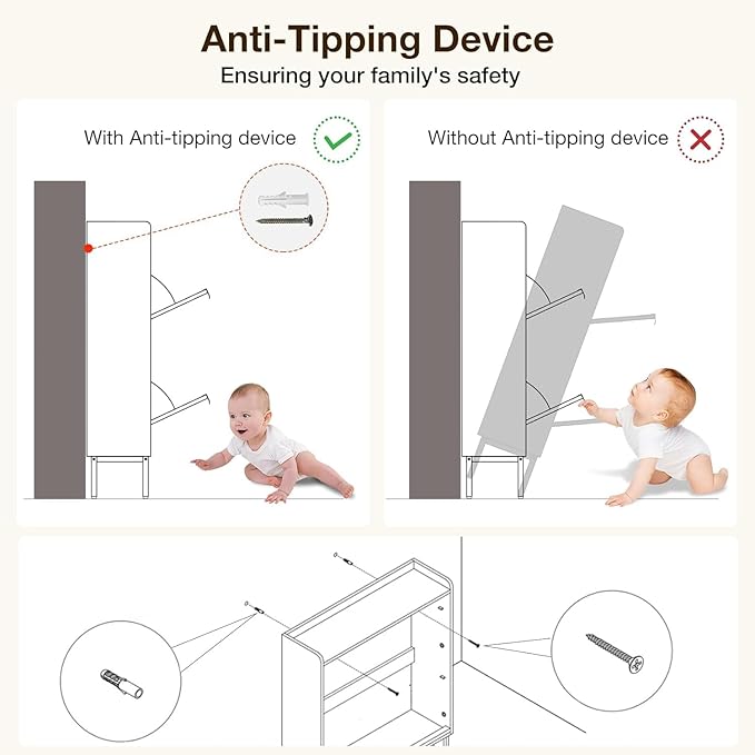 - Safe and Reliable: Shoe cabinet storage for entryway is made of high-quality mdf with a solid structure, ensuring excellent load-bearing capacity. The adjustable feet provide strong stability for the shoe cabinet. We also equip the shoe cabinet with an anti-dumping device, which can be fixed to the wall to prevent tipping and protect the safety of kids