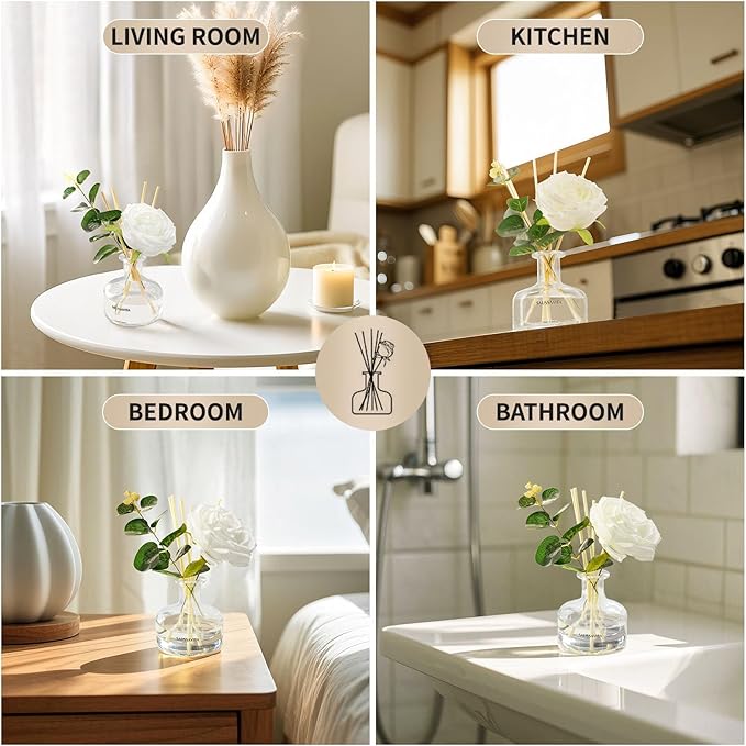 - Complete Reed Diffuser Set Includes: (1) 7.1oz (210ml) natural fragrance concentrates (210ml); (2) simple but unique design glass bottle; (3) an artificial rose; (4) a simulated eucalyptus; (5) 7 reed diffuser sticks; (6) an adjustable satin ribbon. Everything needed for stylish home fragrance decor.