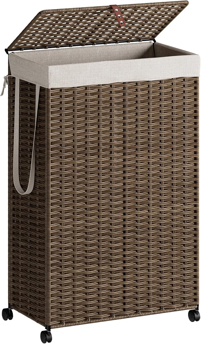 - Durable and Waterproof: Made from waterproof synthetic rattan, the 90l slim wheeled laundry hamper is ideal for humid areas like bathrooms or poolside. The iron frame provides strength to hold up to 45 lbs, while its lightweight structure allows for easy movement.