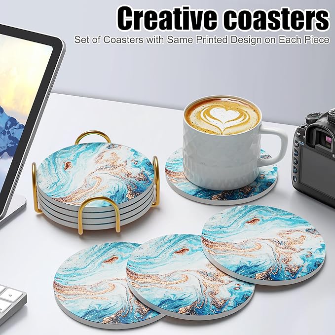 Coasters for Drinks Set of 4, Absorbent Ocean Style Marble with Metal Golden Holder, Ceramic Coaster Set Cup Mat for Home Decor, Bar, Kitchen, Party