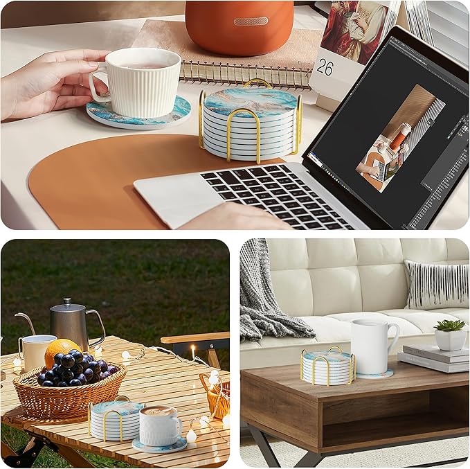 Coasters for Drinks Set of 8, Absorbent Ocean Marble with Metal Golden Holder, Ceramic Coaster Set Cup Mat for Home Decor, Bar, Kitchen, Party