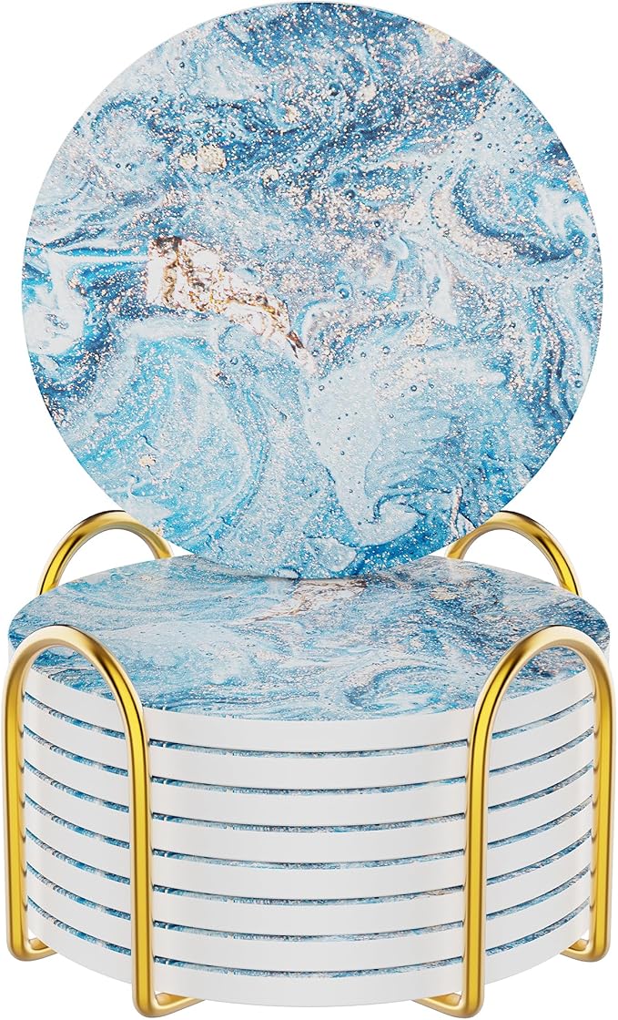 Coasters for Drinks Set of 8, Absorbent Starry Sky Marble with Metal Golden Holder, Ceramic Coaster Set Cup Mat for Home Decor, Bar, Kitchen, Party