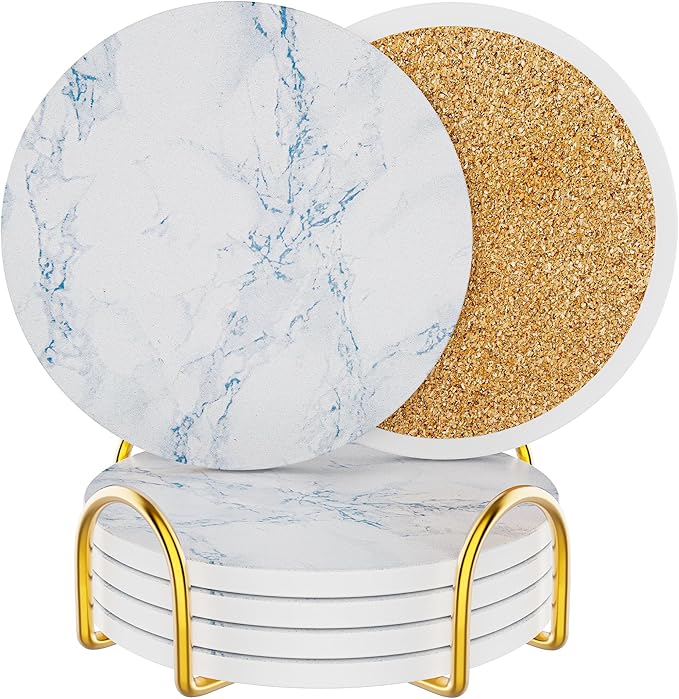 Coasters for Drinks Set of 4, Absorbent Ivory Marble Style with Metal Golden Holder, Ceramic Coaster Set Cup Mat for Home Decor, Bar, Kitchen, Party