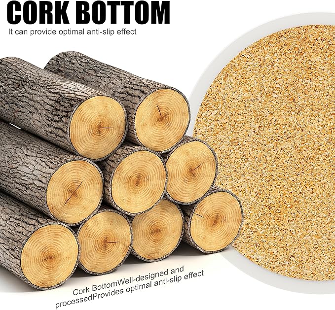 - CORK BASE:Each ceramic coaster is equipped with a cork back pad, which won’t scratch your tables and other surfaces and provides a non-slip surface to prevent your cup fall off.