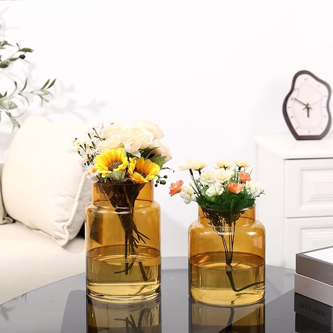 Large Glass Vase, Amber Glass Vase Set of 2, Large Flower Vases for Bouquet, Tall Wide Mouth Vases for Flowers, Home, Wedding, Living Room, Office Decor, 7"+9"