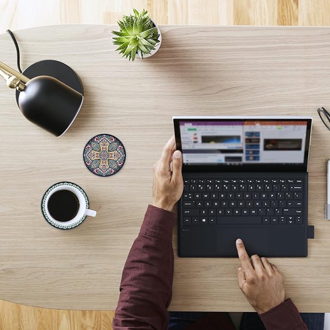 Coasters Absorbent Ceramic Coaster Drink Coasters with Cork Back Turkish Mandala Pattern Set of 6 Round Coaster Non Slip for Coffee Table Wine Glass Home Bar 4 Inch, Colorful