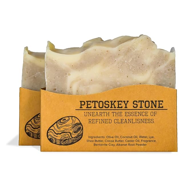 - PURE & SIMPLE FORMULA: Made with minimal ingredients, Petoskey Stone mens soap bar offers a straightforward clean. Infused with Wild Cypress, Frankincense, Amber, it provides a refreshing scent without unnecessary additives.