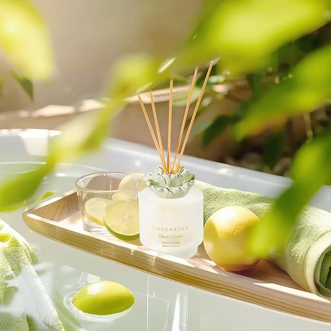 Cocorrina Gypsum Flower Reed Diffuser Set for Bathroom Décor – Clean Linen Scent, 6.76 oz with Sticks & Oil – Home Fragrance for Bathroom & Living Space
