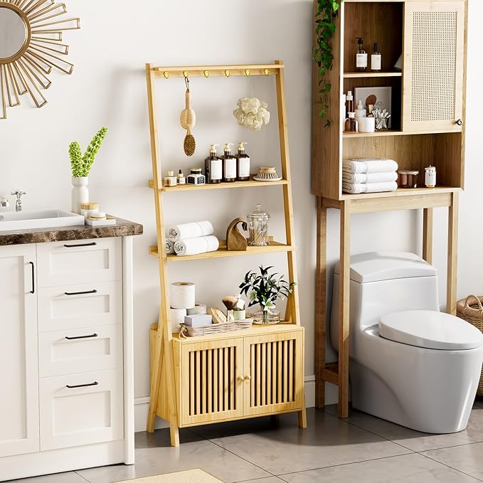 - 【Large Capacity Ladder Bookshelf】- This ladder shelf bookcase features 3 open shelves, 6 hooks and a storage cabinet with doors. Each shelf's edge is designed with a safety back panel to prevent items from falling. The bottom cabinet with doors can store your important documents or personal items so as to guarantee your privacy. Provides you with ample space to place family photos, books, plants, decorations, CDs or other daily necessities.