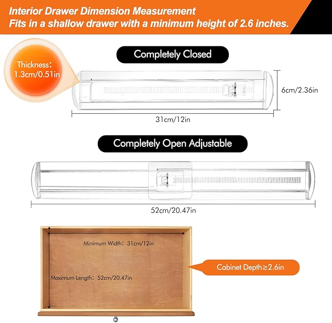 - [Extensible and Adjustable]: With the height of 2.3 inches, the adjustable length of our drawer dividers ranging from 13" to 21", which can be easily installed in most drawers and cabinets, keeping your drawers tidy at all times, helps you find what you need instantly