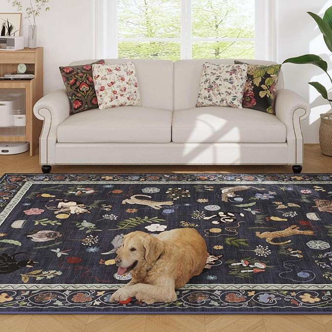 Living Room Rug 5x7 Rug Machine Washable Boho Area Rug Non Slip Floral Animal Cat Vintage Low Pile Large Rugs for Living Room Bedroom Farmhouse Dining Room Kids Playroom, Cobalt Blue