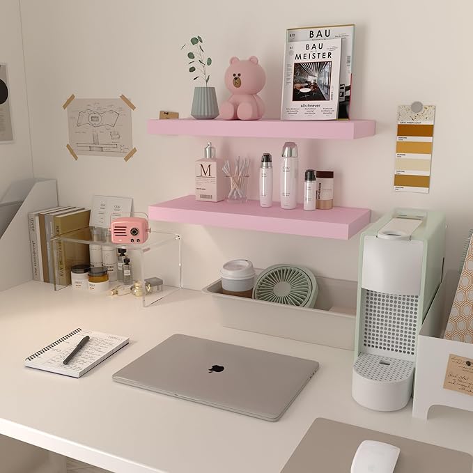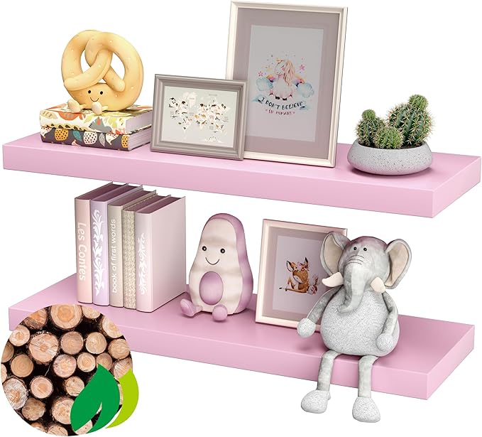 Pink Floating Shelves for Wall - 17 Inch Natural Wood Shelves for Bathroom, Bedroom, Kitchen Decor, Farmhouse Decor Set of 2