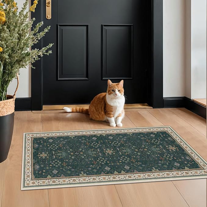 Dark Green Oushak 2x4 Entryway Rug - Modern Vintage Boho Eclectic Floral Pastel, Washable Low Pile Non-Slip Small Throw Area Rugs for Door Mat Indoor Entrance, Kitchen, Bathroom, Bedroom, Laundry