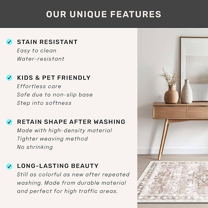 - Secure Grip: Equipped with a non-slip rubber backing, this rug provides a secure grip on your floors, preventing accidents and offering peace of mind