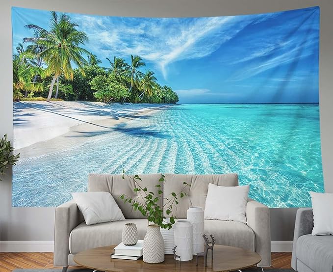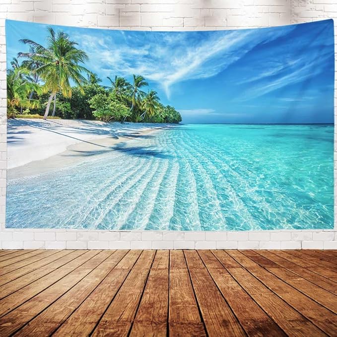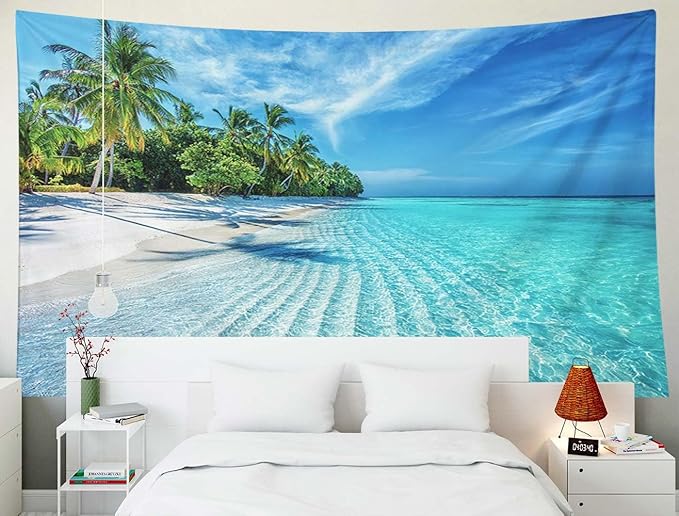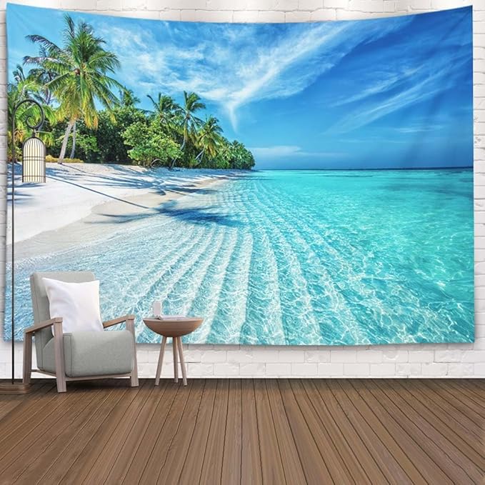 EMMTEEY Beach Tapestry Wall Decor 60X50 Inch-Summer Calm Sea Waves with Palm Trees Durable Wall Art for Bedroom