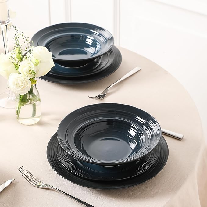- Service for 4: Celest settles you into every meal—from a quiet breakfast to a family dinner and beyond. Generously sized to include 4 wide, uniquely shaped 10" dinner plates, 4 8.5" salad plates, and 4 large 8.3" pasta bowls, you're all set to serve any and every meal.