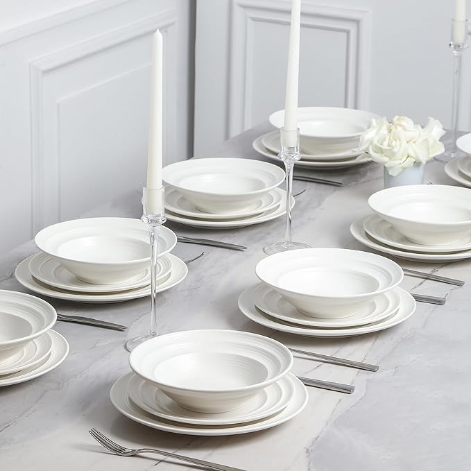 - Service for 4: Celest settles you into every meal—from a quiet breakfast to a family dinner and beyond. Generously sized to include 4 wide, uniquely shaped 10" dinner plates, 4 8.5" salad plates, and 4 large 8.3" pasta bowls, you're all set to serve any and every meal.