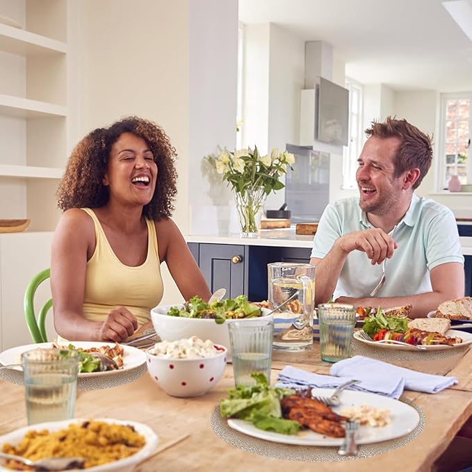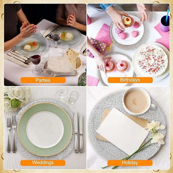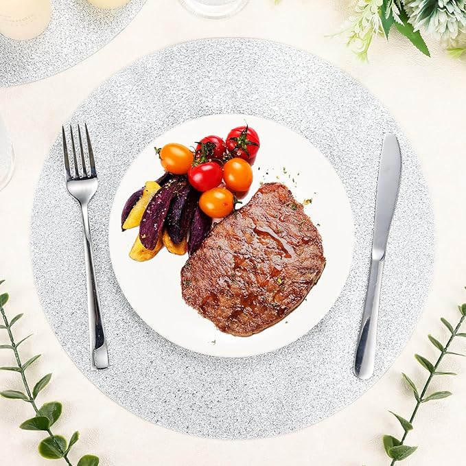 - Elegant Design: These 13-inch round disposable placemats feature a stunning silver foil design, perfect for adding a touch of sophistication and glamour to your event. The intricate mesh pressed paper material creates a beautiful shimmer that catches the light, making them ideal for weddings, birthdays, church banquets, and other special occasions.