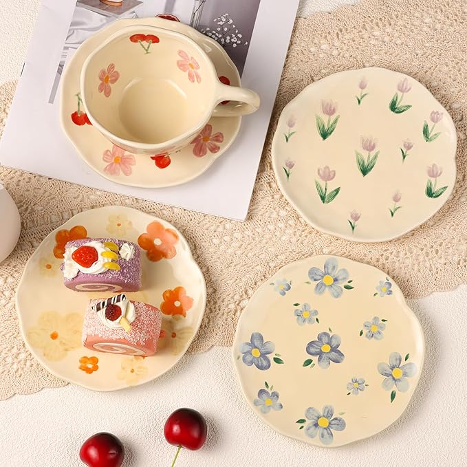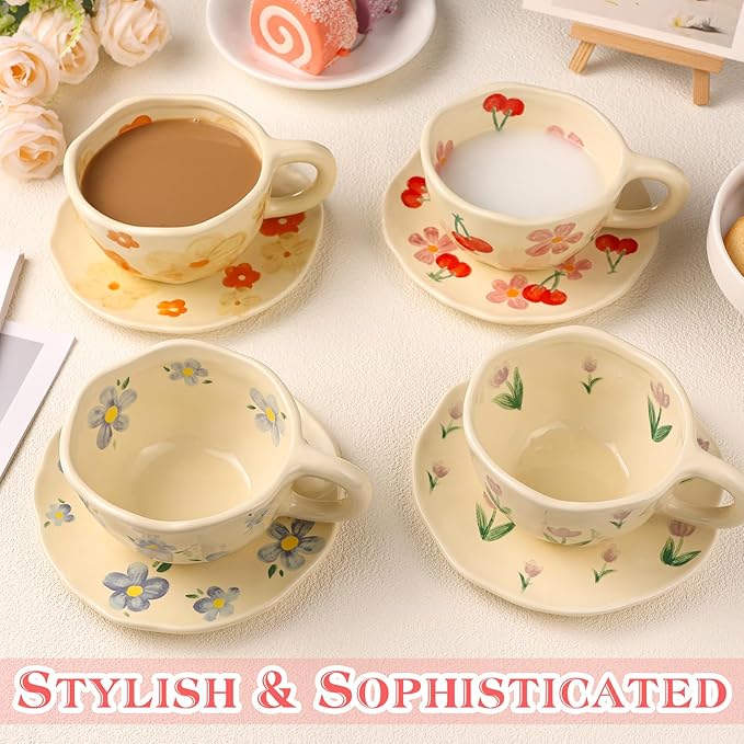 Cappuccino Cup with Saucers Set of 4 Ceramics Coffee Mugs 8 oz Latte Art Cup Vintage Aesthetic Flower Barista Cups for Americano, Tea, Espresso,Mocha, Milk - Microwave and Dishwasher Safe